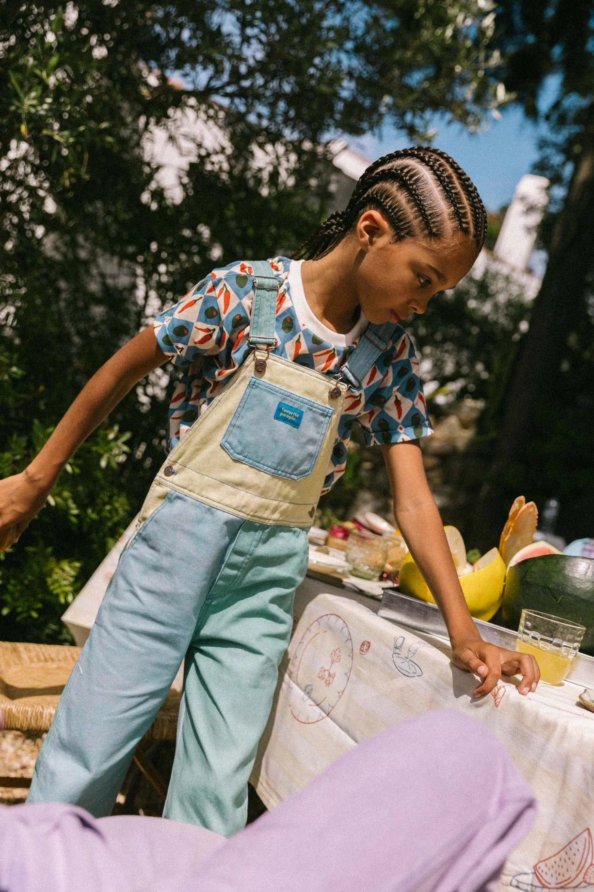 De kleurvlakken maken deze overall vrolijk en eigen, zonder dat het druk wordt. Het is precies zo’n item dat meteen af is: aantrekken, iets simpels eronder en klaar. En omdat hij unisex is, werkt hij voor elk kind — los van hokjes, gewoon lekker vrij.