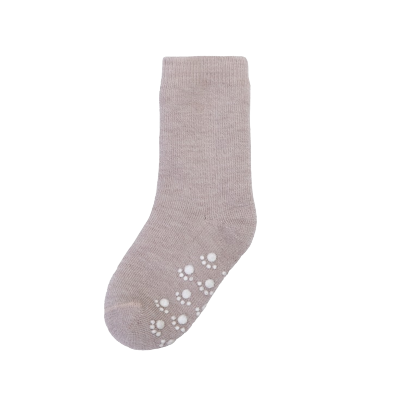 Deze Joha merino wollen sokken met antislip in Beige Melange houden de voetjes van je kind warm én stevig op de grond. De zachte merinowol reguleert de temperatuur, terwijl de rubberen nopjes op de zool grip geven op gladde vloeren. Ideaal voor thuis, de opvang of als je kindje net leert staan en lopen.