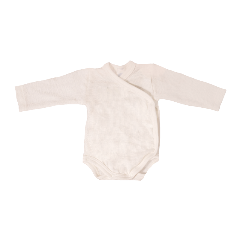 Dieser Wickel-Strampler von Cosilana besteht aus einer wunderbaren Mischung aus Bio-Merinowolle und Seide – superweich, atmungsaktiv und temperaturregulierend. Genau das Richtige für die ersten Wochen (und lange danach).