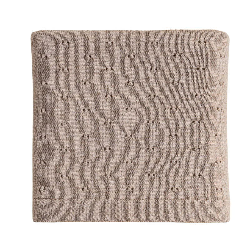 Die Bibi Decke in Sand ist eine warme, erdige Farbe, die Ruhe und Weichheit ausstrahlt. Das zarte Lochmuster macht diese Decke nicht nur praktisch, sondern auch schön. Ein Favorit für das Kinderbett, unterwegs im Kinderwagen oder einfach auf dem Sofa.