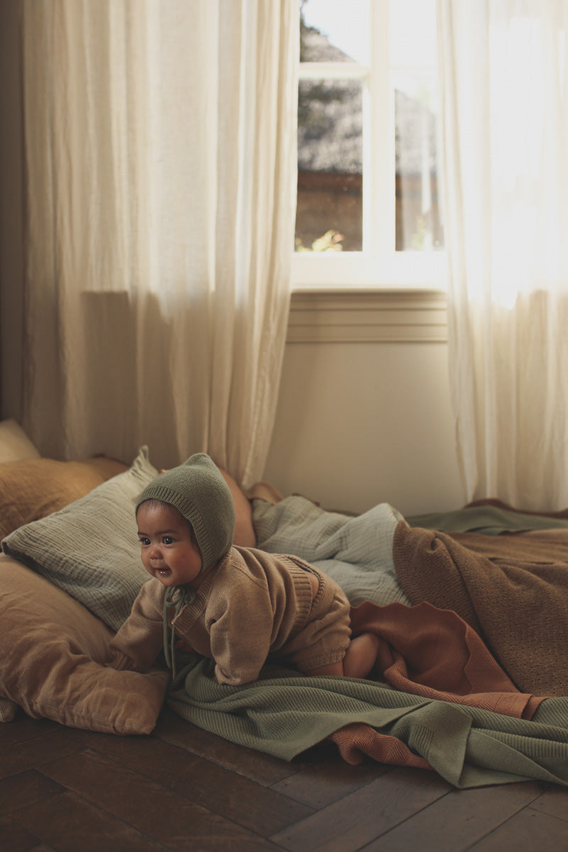 Dolly heeft een gemiddelde dikte: nét iets warmer dan de Bonnet Newborn, maar nog steeds ademend genoeg om het hele jaar door te gebruiken 🍃. Perfect om zowel binnen als buiten te dragen.